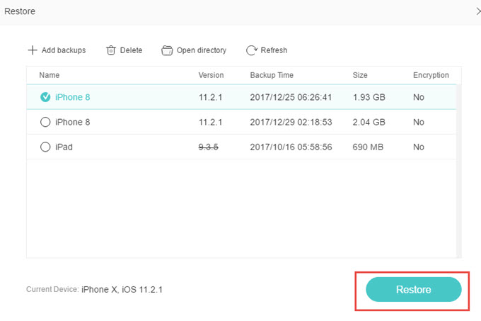 To Restore a Backup to your phone, stay on the “Backup & Restore” tool, and choose “Full Restore”. It will display all the backups. You can click the “Add backups” option to import other backups or just check the existed backup. Click “Restore” to get the files back on to your mobile.